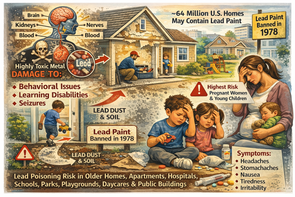 In 1978, the United States banned the use of lead-based paint in houses, hospitals, schools, parks, playgrounds, daycares, and public buildings. Today, about 64 million U.S. homes may contain lead-based paint. Lead is a highly toxic metal that may cause a range of health problems, especially in young children. When lead is absorbed into the body, it can cause damage to the brain and other vital organs like the kidneys, nerves, and blood. Lead may also cause behavioral problems, learning disabilities, seizures, and in extreme cases, death. Children and pregnant women are at highest risk for lead poisoning. Some symptoms of lead poisoning may include headaches, stomachaches, nausea, tiredness, and irritability. Children who are lead poisoned may show no symptoms. Both inside and outside the home, deteriorated lead-paint mixes with household dust and soil may be tracked into the home.